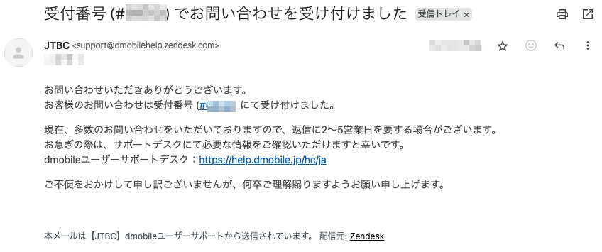 サポートデスクへメールでお問い合わせをした後には、下記のような「自動返信メール」が届きます。