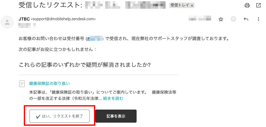 その際に「はい、リクエストを終了」を押下すると、問い合わせが解決済みとなり、担当者からの返信は届きませんのでご注意ください。