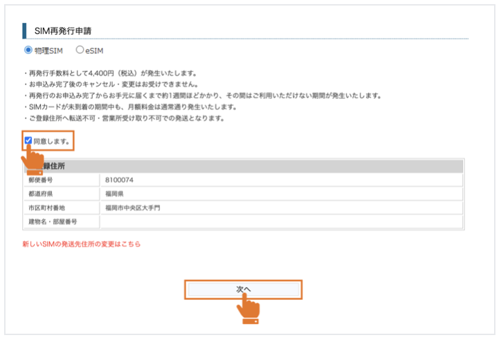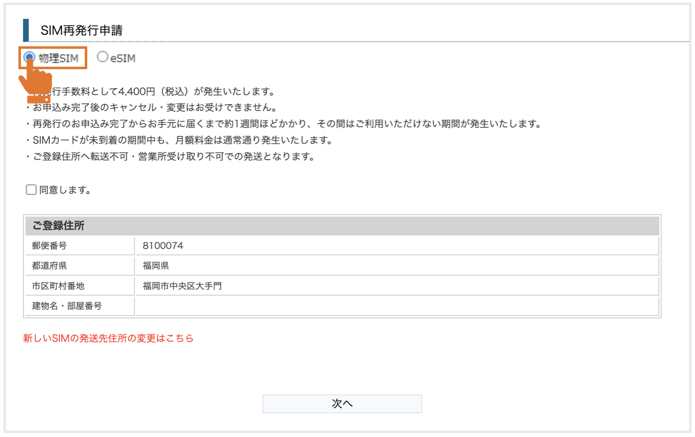 ※配送先の変更は申請画面内の「新しいSIMの発送先住所の変更はこちら」から登録住所を変更してください。