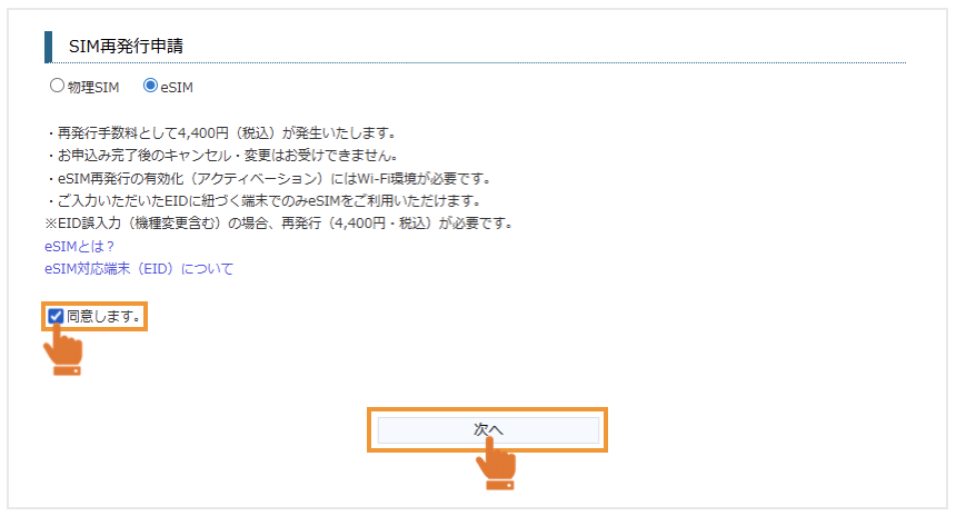 - eSIM再発行後、7日間は物理SIM再発行不可です。
